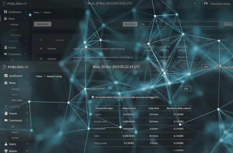 Perihal monetisasi konten, menggunakan Publish dirasa sangat mudah. Anda dapat membuat token digital Anda, khusus untuk media siber Anda. Tapi, fitur ini hanya tersedia di fitur Pro. Misalnya, Anda bisa menyetel imbalan untuk login senilai 0,02 NEWS dan menetapkan batasan, misalnya hanya 10 kali per hari dengan maksimal token 0,2 NEWS. Pengaturan imbalan lainnya bisa Anda terapkan untuk Article Read, Comments, Likes dan Forum Posts.