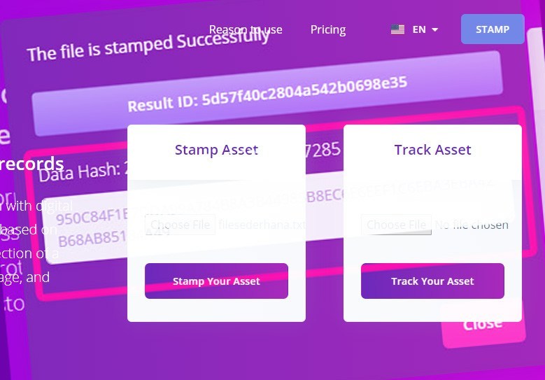 1. Buka website Trusti.id dan klik tombol Stamp di sudut kanan atas. Pilih file Anda dari bagian Stamp Asset, lalu klik tombol Stamp Your Asset. Seketika muncul Result ID. Klik tombol Result ID untuk melihat data hash atas file tersebut. Dalam hal ini kami mempunyai data hash sebagai berikut: 950C84F1E7DDA99A784B8A3B44985B8EC6E6EEF1C6EBA3EBA42B68AB85184A49
