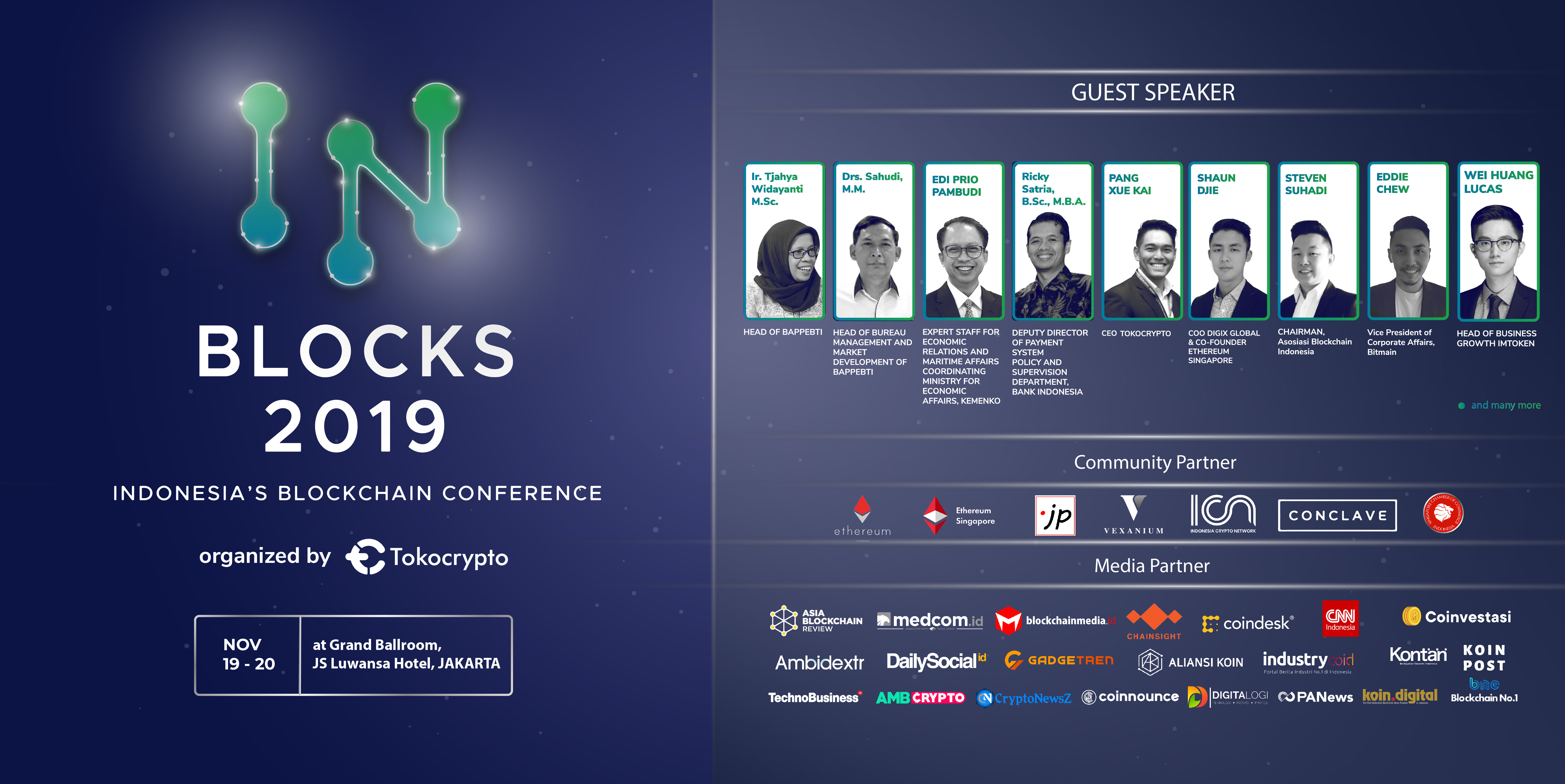 Jakarta, 17 Oktober 2019 – Sebulan menjelang penyelenggaraan Inblocks 2019 dan Indonesia Blockchain Week, Tokocrypto, pedagang aset kripto terdepan di Indonesia, secara resmi mengumumkan para pembicara serta tamu VIP yang telah dipastikan hadir.