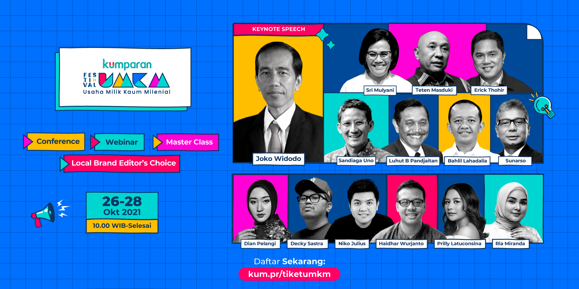 Festival UMKM akan diisi oleh figur publik ternama yang juga merupakan pelaku bisnis seperti Prilly Latuconsina (selebritas & Founder SINA), Ria Miranda (Creative Director RiaMiranda), Dian Pelangi (desainer), Decky Sastra (Founder Rawtype Riot & Pemenang Local Brand Editor’s Choice 2020), Niko Julius (digital marketing expert), dan lainnya. Mereka akan membagikan pengalaman serta pengetahuannya dalam merintis bisnis yang mereka jalani selama ini.