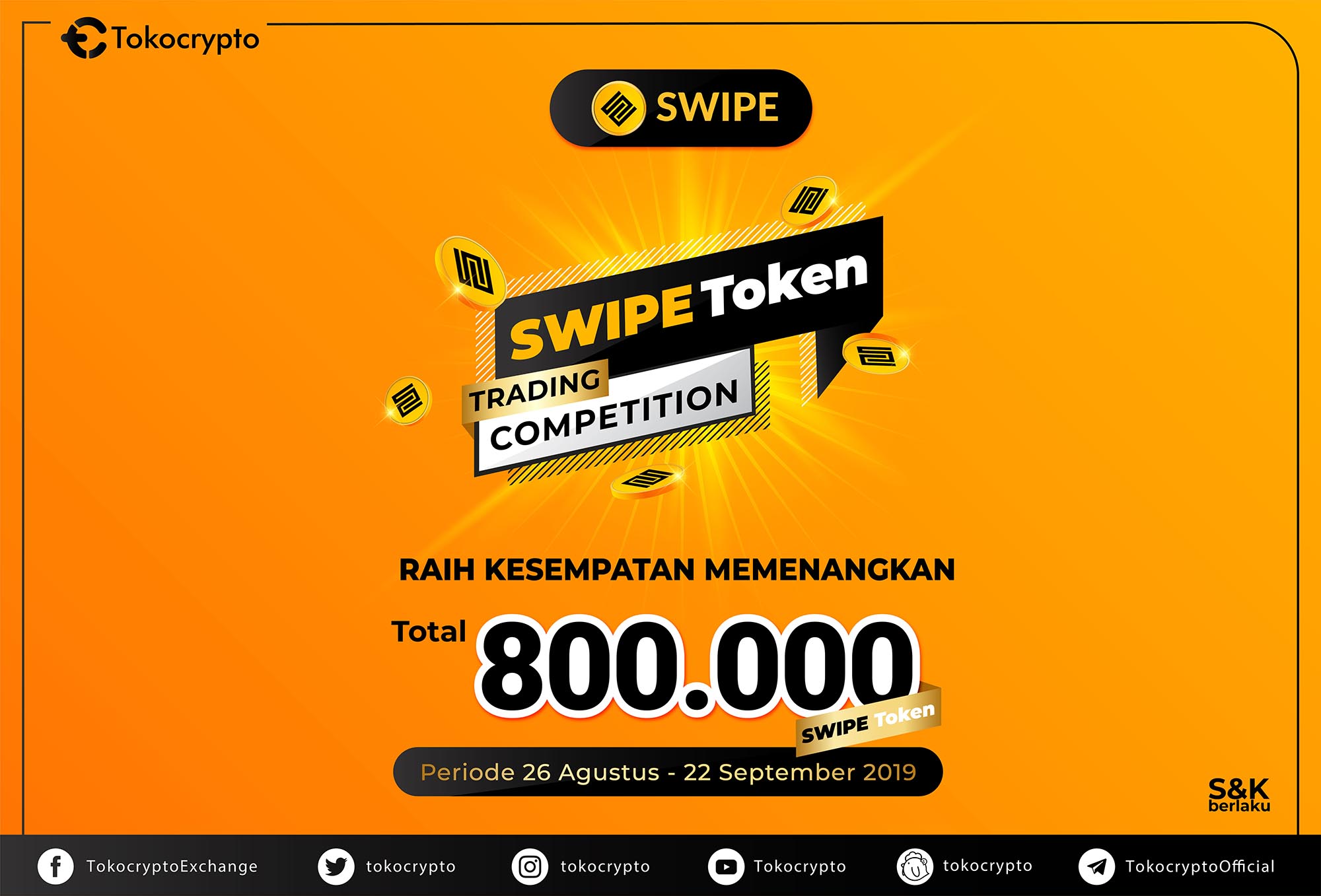 Dalam rangka menyambut kehadiran SWIPE, Tokocrypto mengadakan Swipe Trading Competition yang akan mulai diselenggarakan pada 26 Agustus 2019 pukul 14:00 WIB dan akan berakhir pada 22...